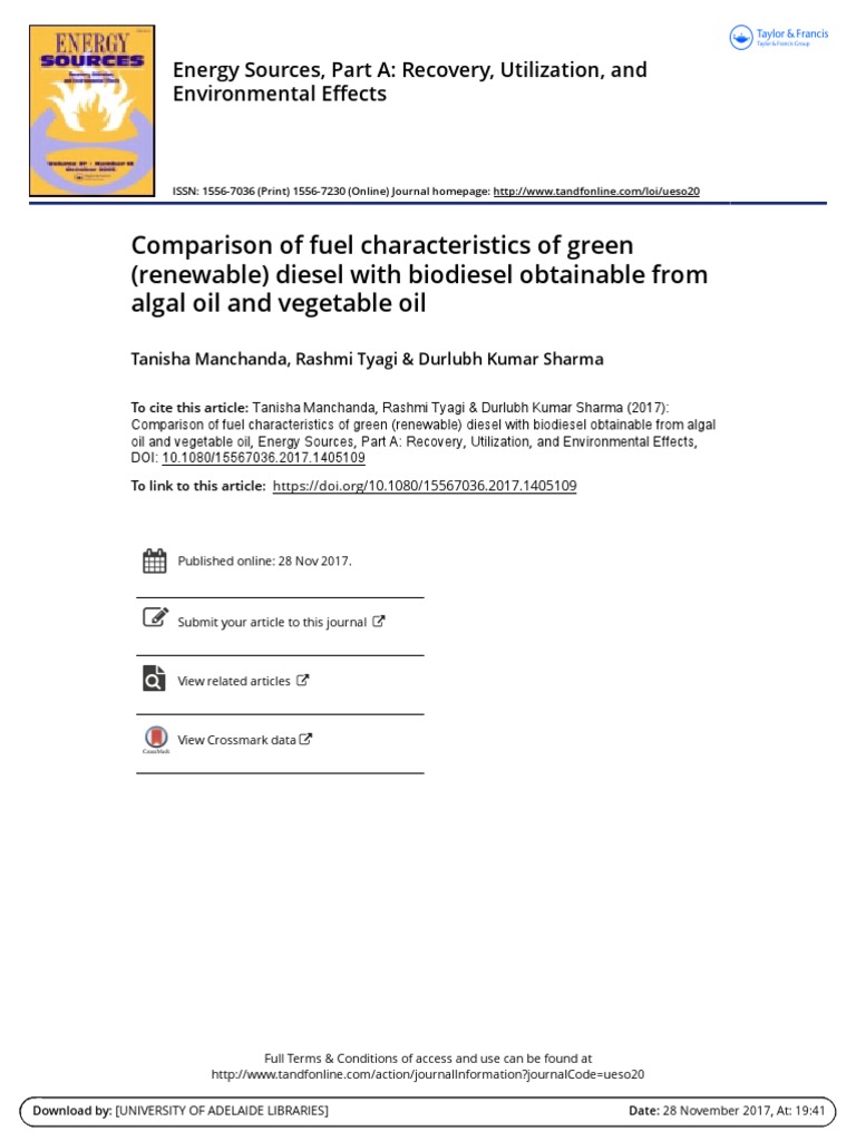 Comparison of Fuel Characteristics of Green (Renewable) Diesel With Biodiesel Obtainable From